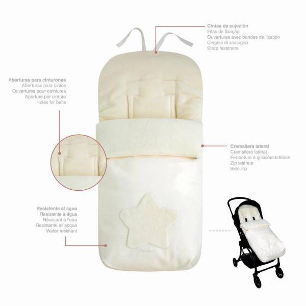 Universal footmuff for any pram, with universal for the slings. Features a soft, super-warm, fluffy inner. Water resistant. Dual zip. Dual format to sheathe the pram backrest. Lower opening for feet to come out. With three levels to regulate height to avoid dragging with a pram. Inner with plastic at foot to prevent staining. With straps to attach it to the pram chassis.